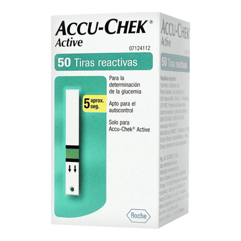Tiras reactivas Accu-Chek Active para la determinación de glucosa en sangre. Con opción de re-dosificación hasta 10 segundos después de aplicar la primera gota. Para uso exclusivo con el medidor de Glucosa Accu-Chek Active