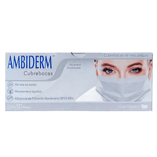 CUBREBOCAS ADULTO 3 PLIEGUES COLOR BLANCO CAJA C/50 PZAS. AMBIDERM
