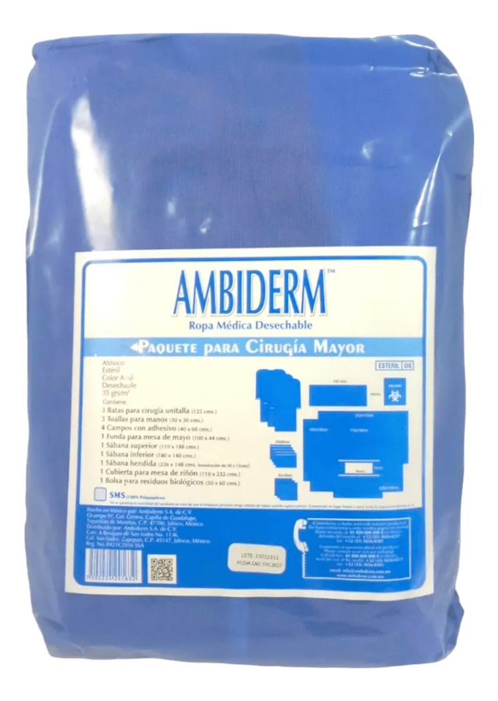 3 Batas para cirugía unitalla (125 cm de largo)3 Toallas para manos (30 x 30 cm)