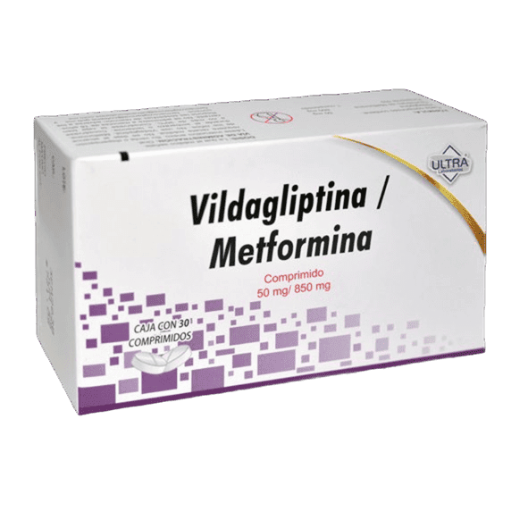 Cada comprimido contiene: Vildagliptina 50mg+Metformina 850mg.